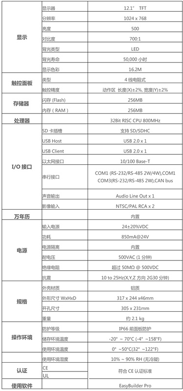 產(chǎn)品特點(diǎn) Installation 鋁合金外殼搭配全新色彩與時(shí)尚設(shè)計(jì) Video Input Ports 支持 NTSC 及 PAL 格式 12.1" 1024x768 TFT 工業(yè)級(jí) LCD 無(wú)風(fēng)扇冷卻系統(tǒng) 內(nèi)置 256MB 儲(chǔ)存內(nèi)存及萬(wàn)年歷 NEMA4/IP66 面板防護(hù)等級(jí) 陶瓷封裝高壽命LED背光 SD 卡插槽支持 SD/SDHC 內(nèi)置電源隔離防護(hù)器 Com1或Com3 RS485 2W 支持 MPI 187.5K CAN bus 裝置支持 CANopen 通訊協(xié)議 Com1 / Com3 RS485 及CAN bus 隔離器內(nèi)置